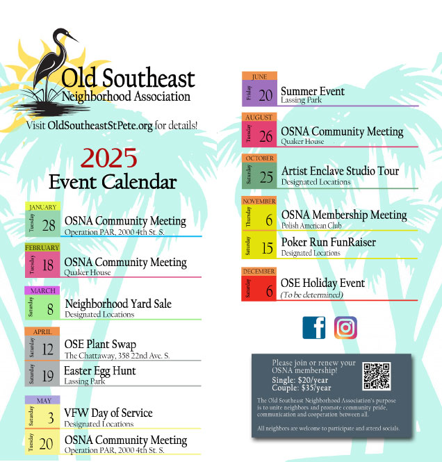 The Old Southeast Neighborhood Association proudly participated in the VFW Day of Service, joining forces with Keep Pinellas Beautiful, the City of St. Petersburg, and local partners to complete one of our most successful cleanup projects to date. Thank you to the 25 dedicated volunteers who came out and helped remove a total of 3,060 pounds of dead plants, litter, and overgrowth along the bypass road near the Army Reserve, Polish American Society, and Coast Guard facilities.